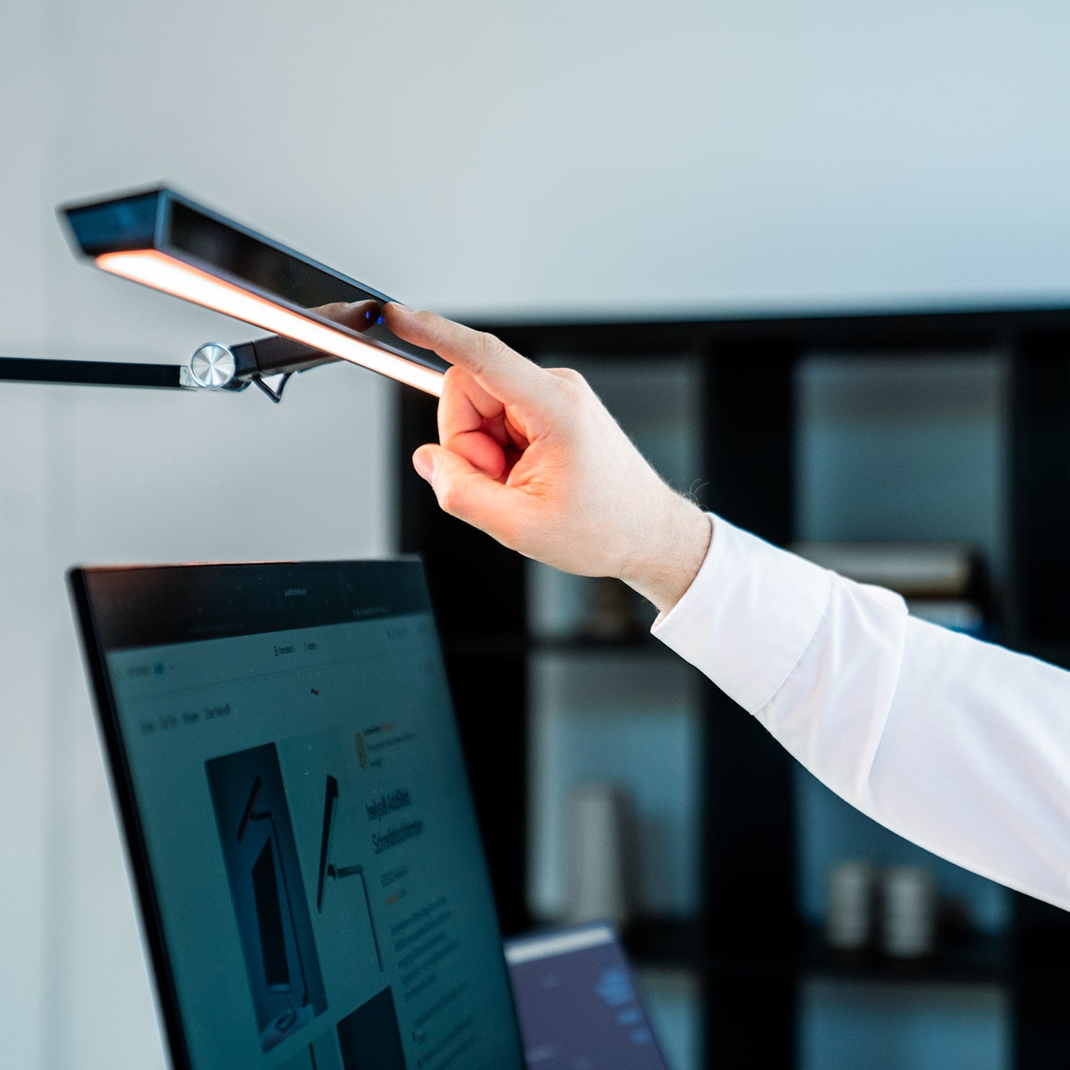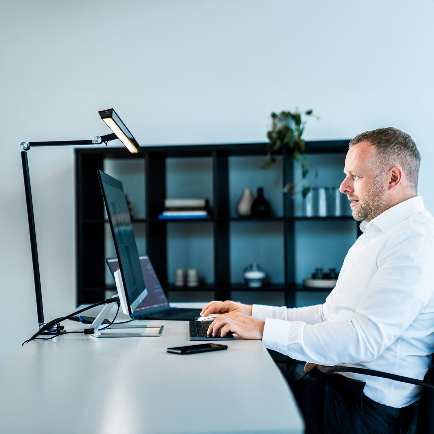 Der Begleiter im Office-Alltag: Vollspektrales Weißlicht und bioaktives Rotlicht schaffen eine einzigartige Balance für spürbar mehr Augenkomfort – vom fokussierten Arbeiten bis zum entspannten Abend.